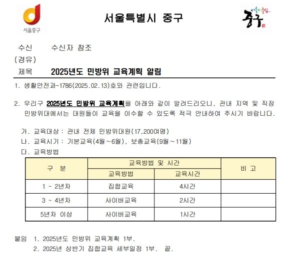 | 다음글 | 2024년 민방위 2차 보충교육 연장 알림 |