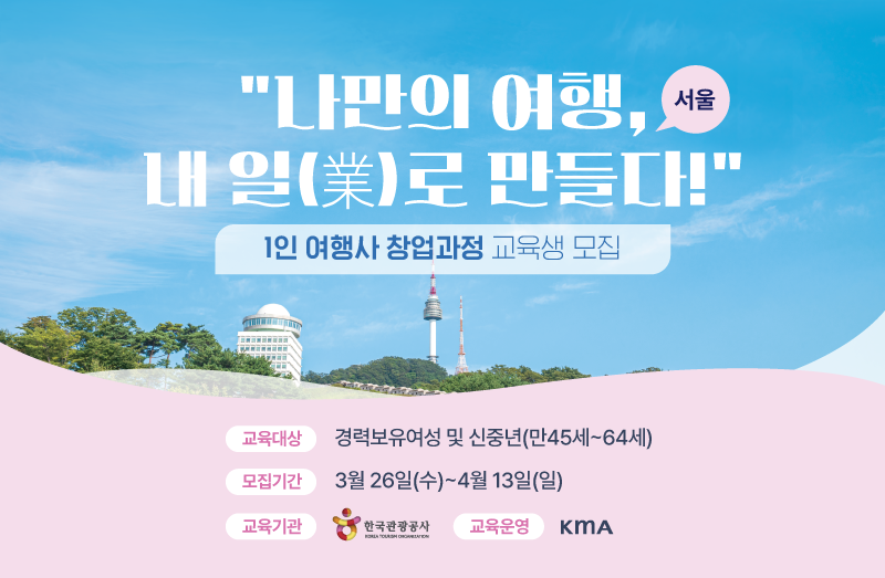 중구청 일자리 MOU 기관 '한국관광공사'에서 신중년 "1인 여행사 창업과정" 교육생을 모집합니다. 경력보유여성 및 신중년(만45세~64세) 여러분의 많은 관심과 참여 바랍니다. ==================================================================== [ (서울/4월) 1인 여행사 창업과정 안내 ] 여행사 브랜딩 및 상품 기획 방법론부터 사업자등록, 세무, 노무 등 사업 운영 행정까지 모든 것을 배울 수 있는 1인 여행사 창업과정(무료교육) 안내드립니다. ▶ 모집대상 : 신중년(만 45~64세) 및 경력보유여성(연령제한 없음) ▶ 모집기간 : 3월 26일(수)~4월 13일(일) ▶ 교육기간 : 4월 21일(월)~5월 2일(금) 10:00~16:00 * 중식 개별식사 ▶ 교육장소 : 한국관광공사 서울센터 15층 대강의실 * 서울특별시 중구 청계천로 40 ▶ 교육비 : 무료 (단, 80% 이상 출석 필수) ▶신청 방법 : 관광인 및 구글폼 작성 - 관광인 : https://academy.visitkorea.or.kr/edu/apply/detail.do?srchEdcCrseId=EDU_0000000455 - 구글폼 : https://forms.gle/fwDMUzcbuatkKX8AA =================================================================
