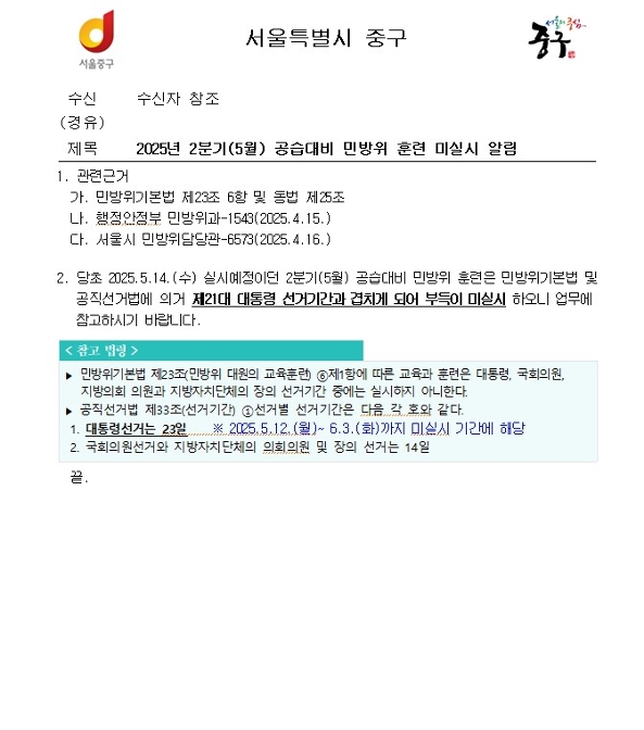 | 2025년 2분기(5월) 공습대비 민방위 훈련 미실시 알림 | |||