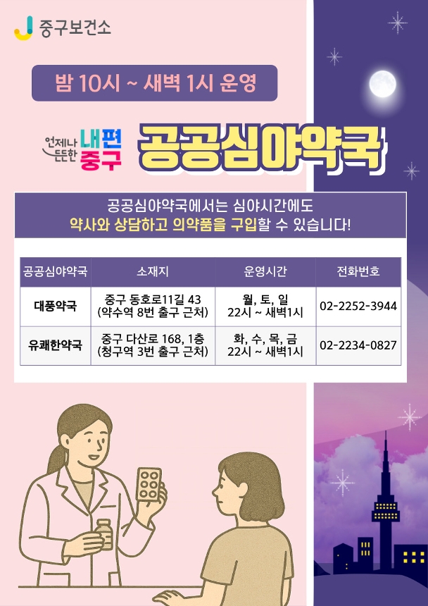 <중구 공공심야약국 운영안내> 심야시간대 구민들의 의약품 구입 불편을 해소하고, 약사의 복약지도로 의약품 오남용을 방지하기 위해 10시~새벽1시까지 공공심야약국을 운영합니다. ○ 중구 지정 공공심야약국 : 2개소