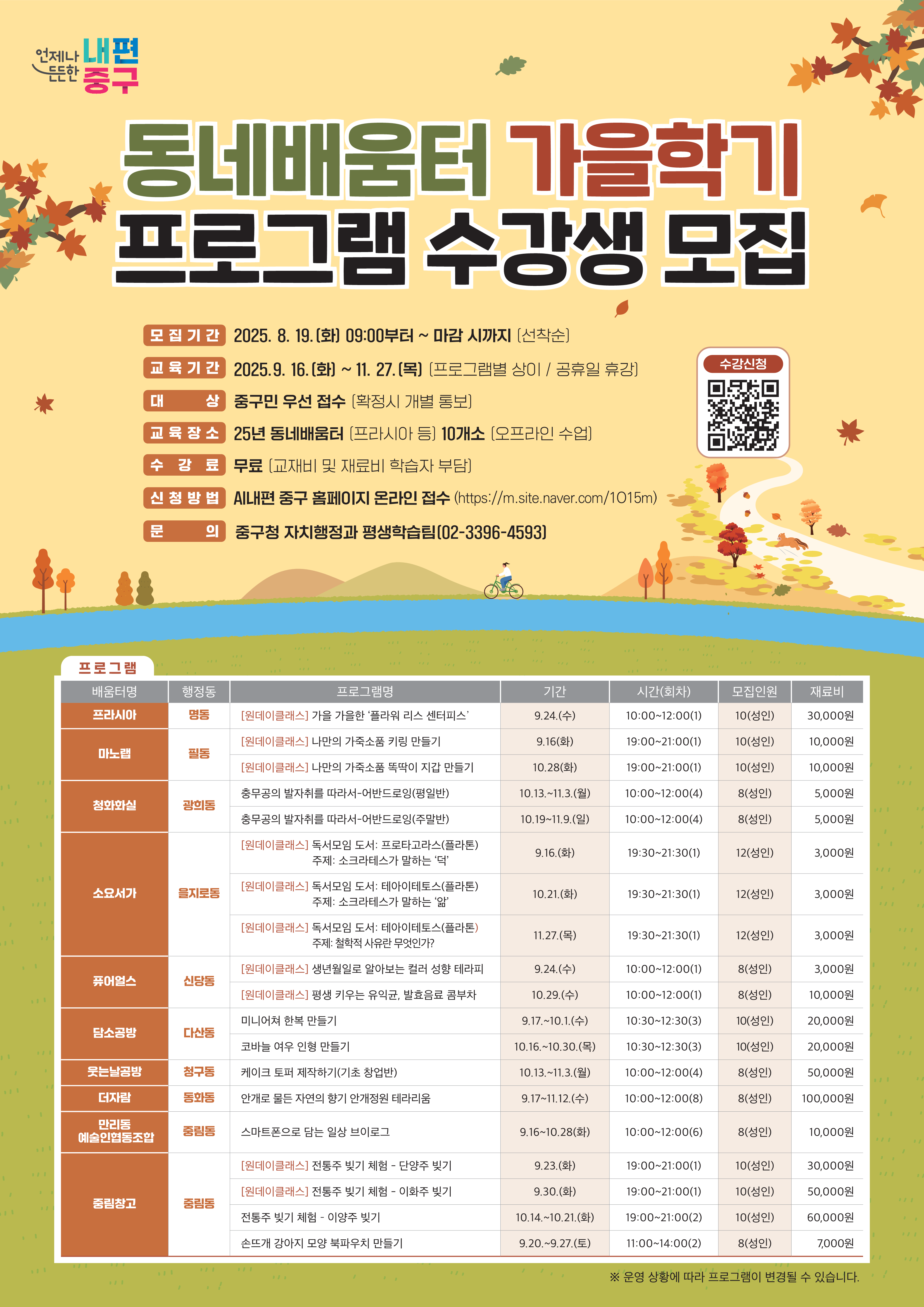 ▣ 운영기간 : 2025년 9~11월 ※ 프로그램별 상이 (공휴일 휴강) ▣ 운영장소 : 소요서가(을지로동) 등 10개소 ▣ 신청기간 : 2025. 8. 19.(화) 09:00~선착순 마감 ※ 중구민 우선 접수, 확정시 개별 통보 ▣ 수 강 료 : 프로그램별 상이 (※ 개강 이후 환불 불가) ▣ 신청방법 : AI 내편중구 온라인 신청 ※ 전화접수 불가 ▣ 문의: 중구청 자치행정과 평생학습팀(02-3396-4593) ※ 수업 중 촬영된 사진은 홍보, 발행물 등의 자료로 활용될 수 있음을 안내드립니다. ※ 해당 프로그램은 수강자 확정시 문자로 재료비 입금 안내드립니다.☆ 재료비 환불 기간: 재료 준비과정으로 개강전 3일~5일(평일기준)까지 환불 가능, 환불 기간 이후 재료로 수령 가능 → 각 배움터의 재료 준비과정이 달라 환불 기간이 다를 수 있습니다. 신청 확정 후, 재료비 환불기준에 대해 다시 안내해 드리겠습니다.