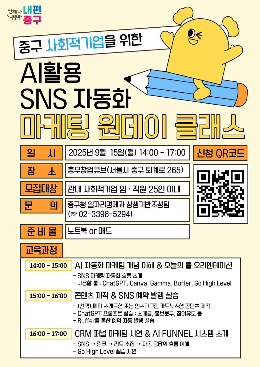 중구 관내 사회적기업 대상 마케팅교육 'AI활용 SNS 자동화 마케팅 원데이 클래스' 참여자를 모집합니다.