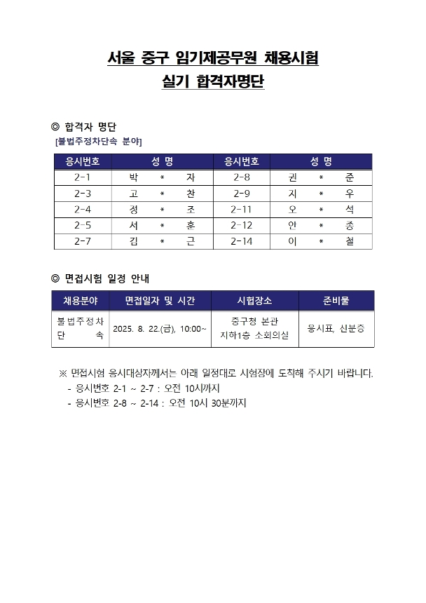 | 서울특별시 중구 시간선택제임기제공무원(주차단속분야) 운전실기 합격자 공개 | |||