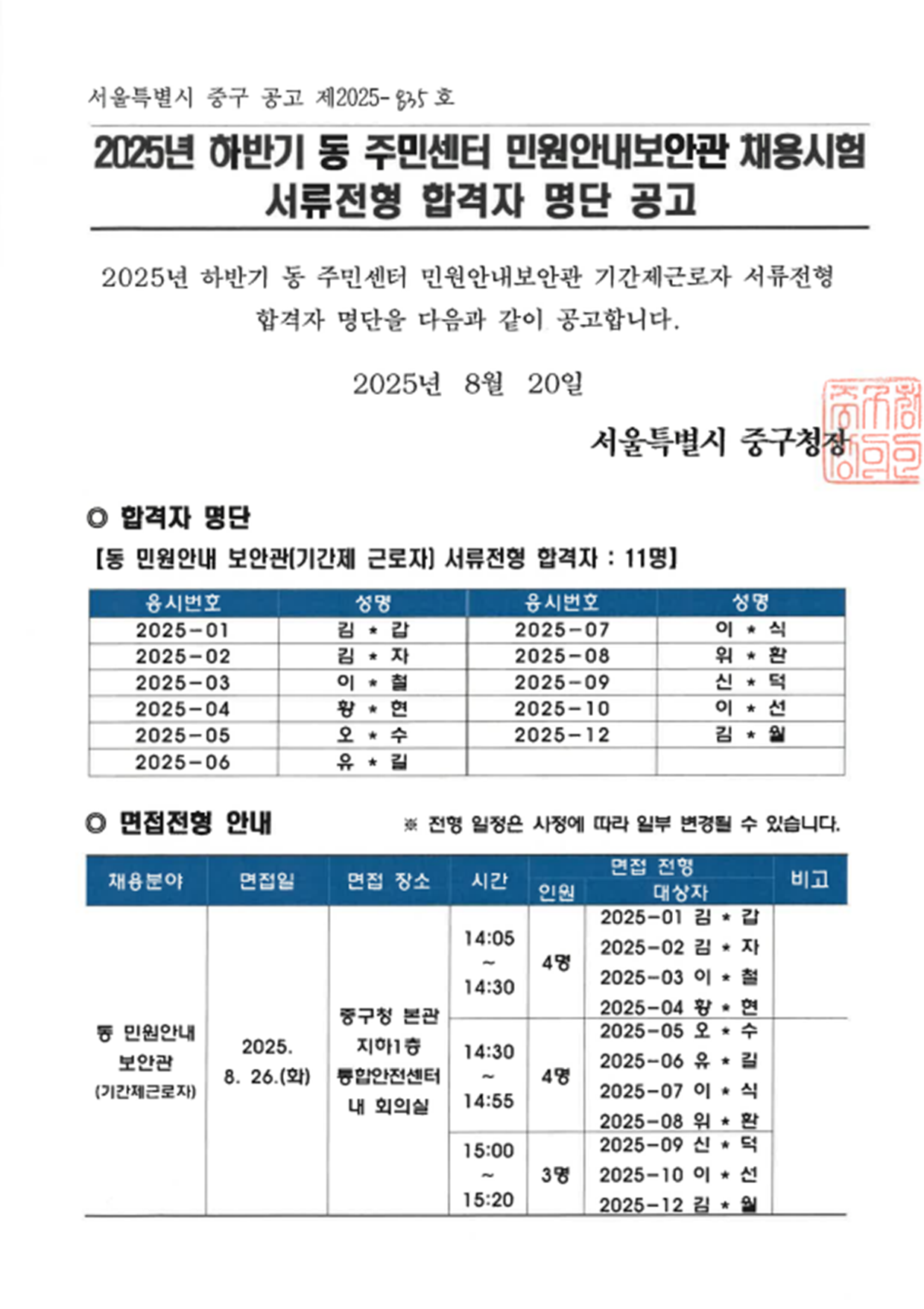 | 2025년 동 민원안내보안관 기간제근로자 서류전형 결과 공고 | |||