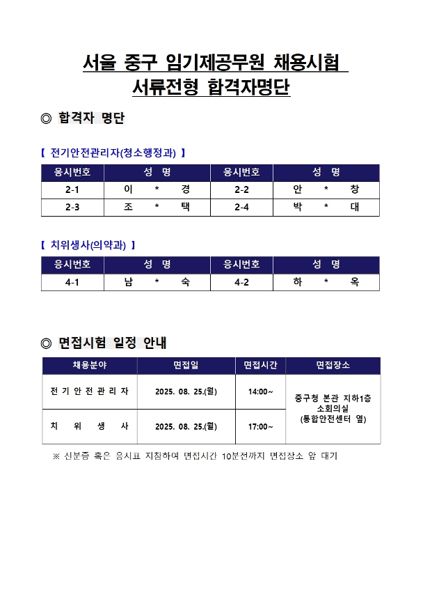 | 서울특별시 중구 임기제공무원 채용시험 서류전형합격자 공고(전기안전관리자, 치위생사) | |||