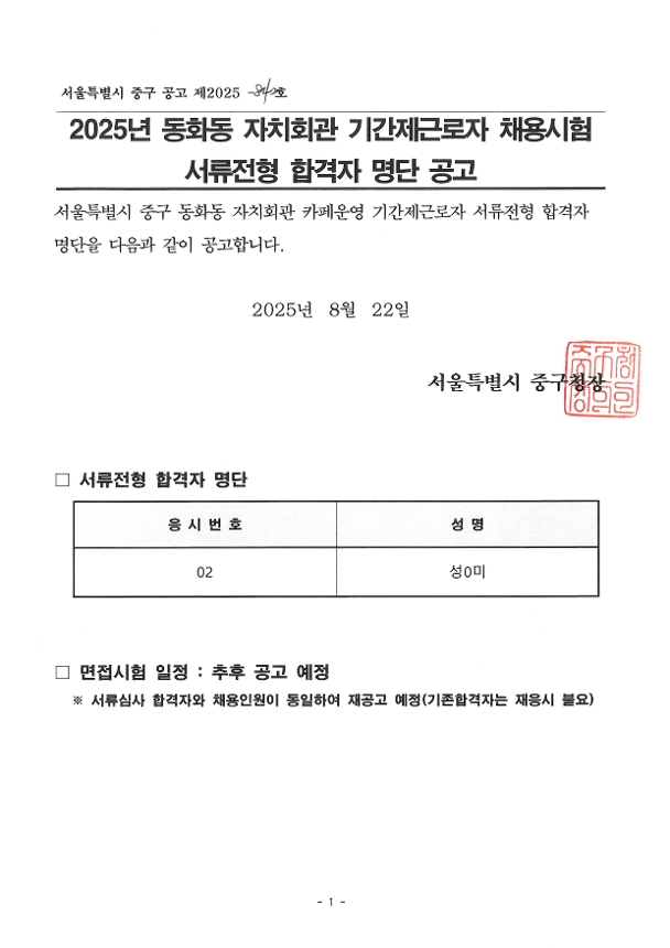 | 2025년 동화동 자치회관 기간제근로자 채용시험 서류전형 합격자 명단 공고 | |||