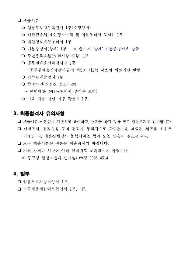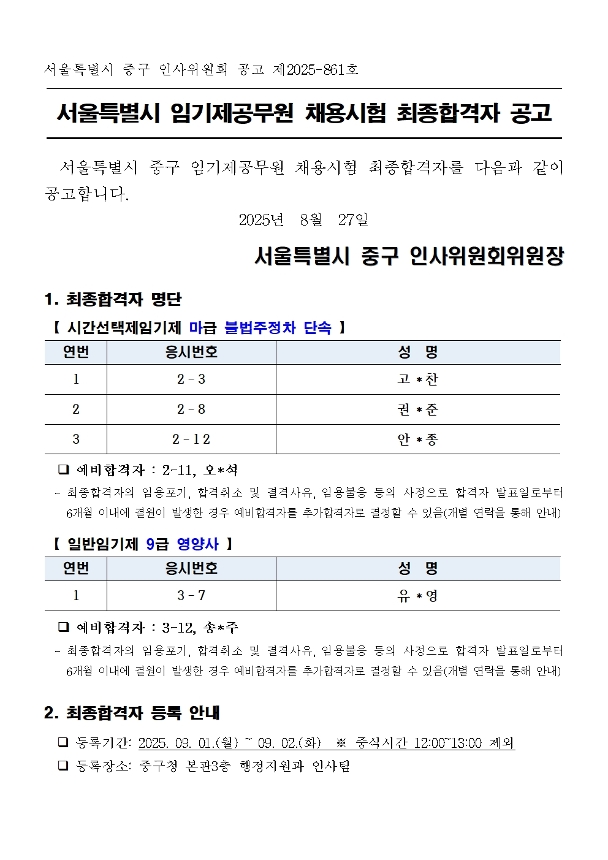 | 서울특별시 중구 임기제공무원 채용시험 최종합격자 공고(주정차단속, 영양사) | |||
