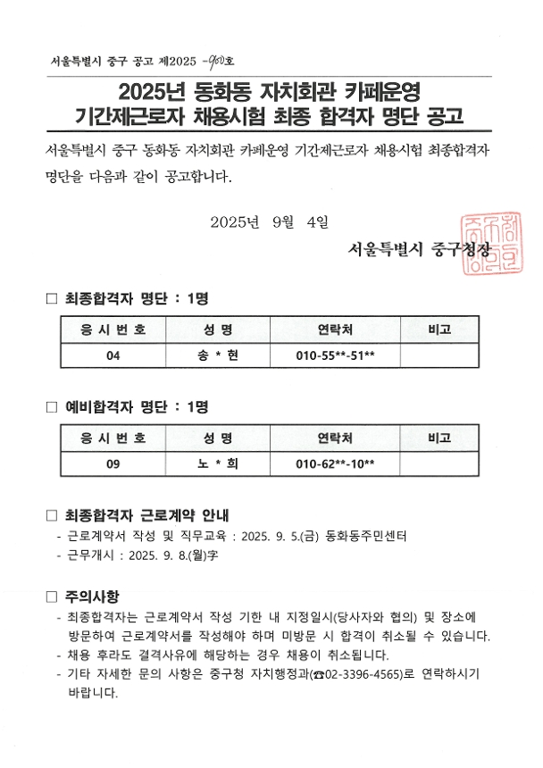 | 2025년 동화동 자치회관 카페운영 기간제근로자 채용 최종합격자 공고 | |||