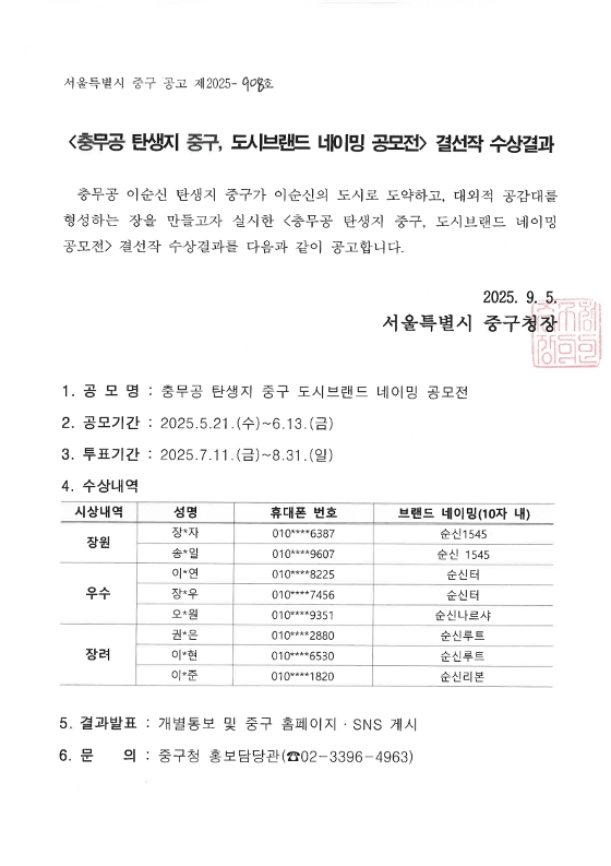 긴 시간 끝에 결선에서 수상하신 모든 분들 진심으로 축하드립니다. 중구가 충무공 이순신의 탄생지로서 거듭날 수 있도록 앞으로도 중구에 많은 관심과 응원 부탁드립니다! 감사합니다! ![]() |