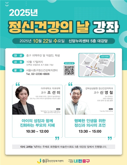 『정신건강의 날 강좌』기념 강좌 ○ 일 시 : 2025. 10. 22.(수) 10:30 ~ 15:00 (1부) 10:30 - 12:00, (2부) 13:30 - 15:00 ○ 장 소 : 신당누리센터 5층 대강당 [서울특별시 중구 다산로33길 3] ○ 대 상 : 중구지역주민 및 직장인, 학생, 관심있는 누구나 (선착순 모집으로 조기 종료 가능) ○ 내 용 - (아주대학교 의학대학 조선미 교수) 아이의 성장과 함께 진화하는 부모의 지혜 - (강북삼성병원 정신건강의학과 신영철 교수) 행복한 인생을 위한 정신과 의사의 조언 ○ 신청방법 : QR 코드, 링크(https://answer.moaform.com/answers/MzpPdm) 참조 ○ 문의사항: 02)2236-6606 중구정신건강복지센터