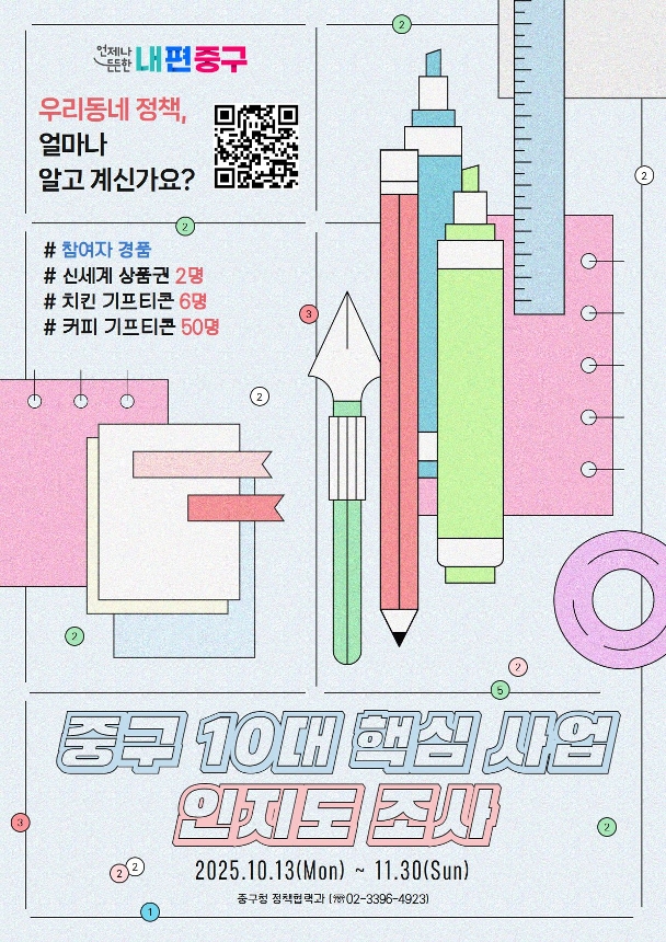 ![]() # 참여기간 : 2025. 10. 13.(월) ~ 11. 30.(일) # 참여대상 : 중구에 관심있는 누구나 # 조사내용 : “중구 10대 핵심사업”의 인지여부 등 < 10대 핵심사업 > ① 남산자락숲길 ② 남산 고도제한 완화 ③ 충무공 이순신 탄생지 중구 ④ 중구 공공시설 셔틀버스 ⑤ 명동스퀘어 ⑥ 대현산 모노레일 & 청구동 엘리베이터 ⑦ 어르신 교통비 지원 ⑧ 주택 재개발사업 신속 지원 ⑨ 중구 상권발전소 ⑩ 중구 건강마일리지 # 참여방법 - 온통중구(https://ontong.junggu.seoul. kr/main.do) - 참여하기 - 설문 - 응모 ※ QR 코드 스캔하시면 바로 접속됩니다. # 참여혜택 : 추첨을 통해 기념품 제공 - 신세계 상품권 5만원 (2명) - 치킨 기프티콘 (6명) - 커피 기프티콘 (50명) # 문 의 : 정책협력과 ☎ 02-3396-4923 # 유의사항 - 경품내용은 내부사정에 의해 변경될 수 있음 - 기프티콘은 수신 동의하신 번호로 문자 발송 - 입력하신 개인정보는 경품발송 후 즉시 파기 - 잘못된 정보입력으로 인해 상품 미지급 시, 중구청에서 책임지지 않음 |