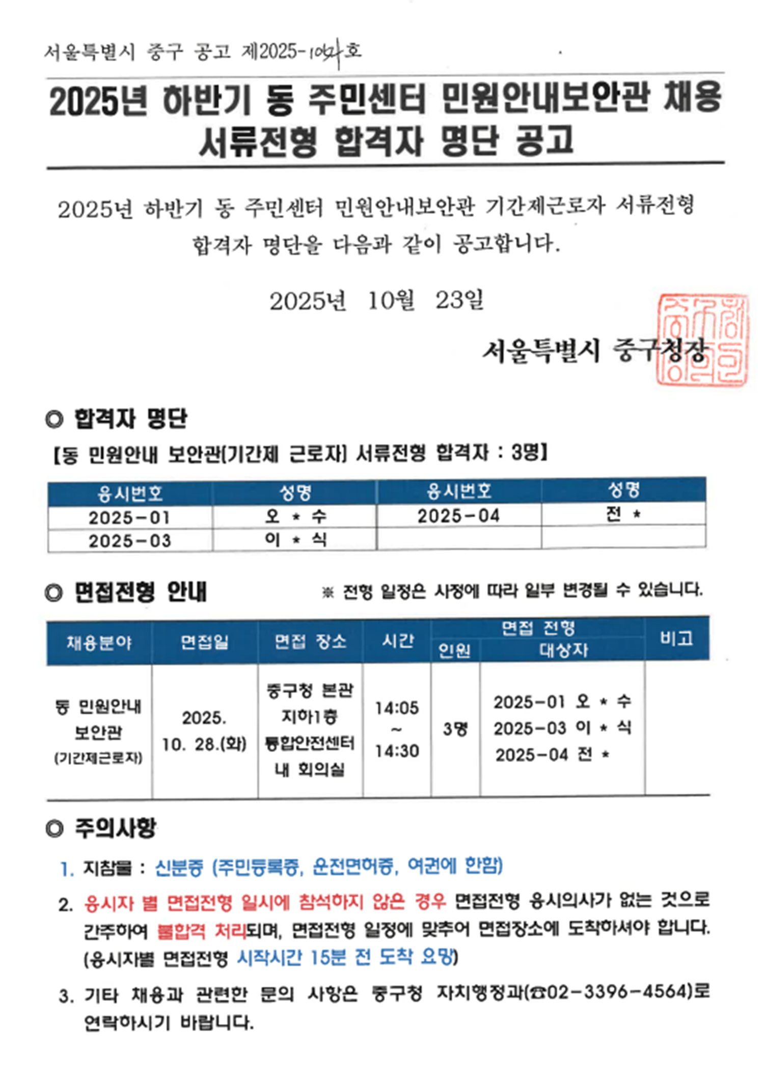 | 2025년 동 민원안내보안관 기간제근로자 서류전형 결과 공고 | |||