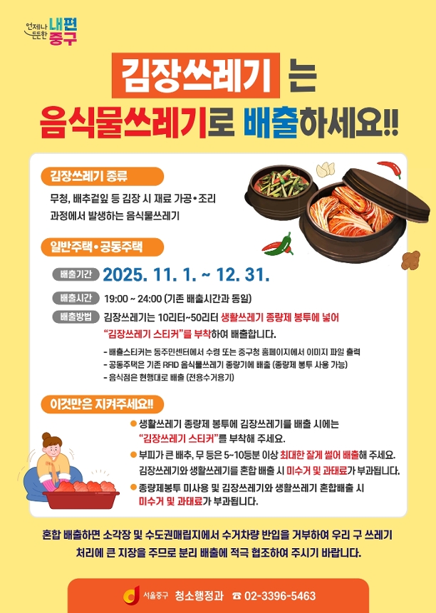 <2025년 겨울철 김장쓰레기 배출 방법 안내> * 배출기간 : 2025.11.1. ~ 12.31. * 배출시간 : 19:00~24:00 (기존배출 시간과 동일) * 배출방법 : 김장철에 발생하는 김장쓰레기는 10~50리터 생활쓰레기 종량제 봉투에 넣어 "김장쓰레기 스티커" 부착하여 배출 가능 - 스티커 배부장소 : 각 동 주민센터 (또는 첨부된 스티커 이미지 파일 출력하여 부착 가능) 단, 김장쓰레기와 일반쓰레기 혼합 배출 시 미수거 및 과태료 부과 예정이므로 유의하시기 바랍니다. ![]() |