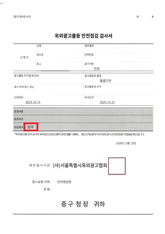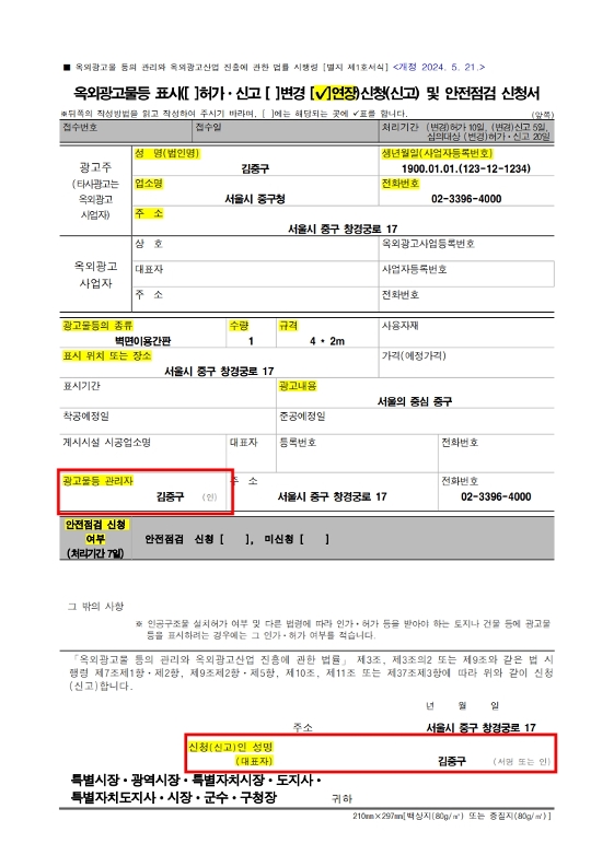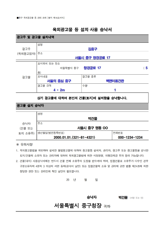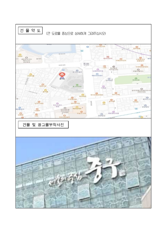 ■ 필요서류(원본) - 자사광고의 경우 1. 옥외광고물 연장 신청서 2. 주변약도 및 주변 원색사진 3. 돌출간판 도로점용 허가 신청서 ※ 돌출간판이 사유지에 설치되면 제출생략 4. 안전검사 합격서류 - 타사광고(전광판, 옥상전광판 등)의 경우 : 건물(토지)주 설치 사용 승낙서 추가 제출 ※ 실소유주와 일치해야 함 ■ 제출장소 ○ 서울시 중구청 별관 5층 도시디자인과 광고물관리팀 ■ 서류예시 ![]() ![]() ![]() ![]() ※ 타사광고(전광판, 옥상전광판 등)의 경우 건물(토지) 사용 승낙서 추가 제출 ![]() |