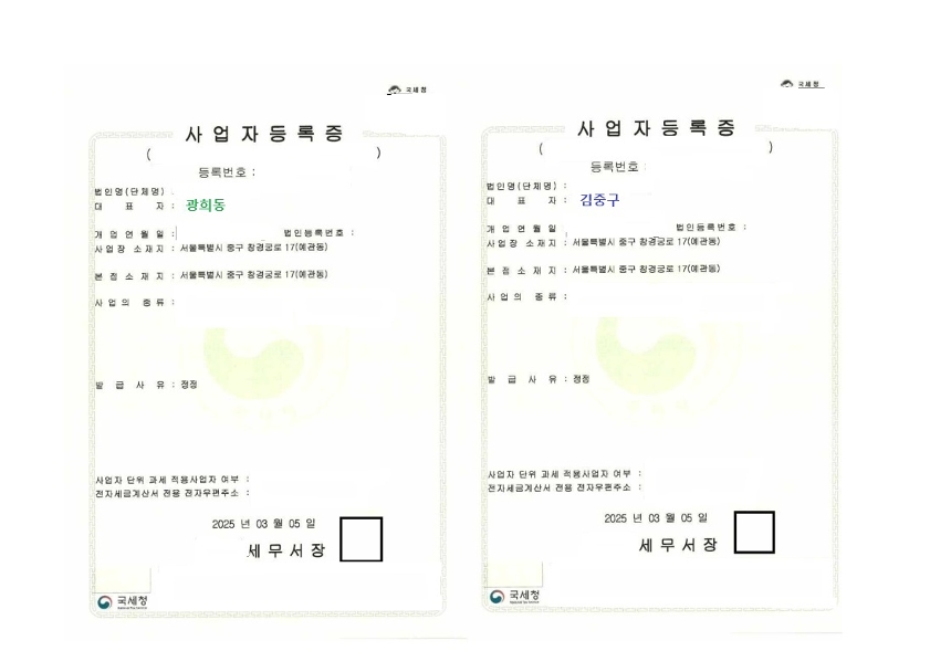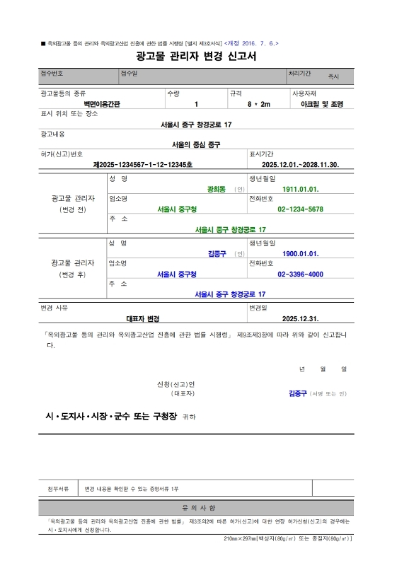 ■ 필요서류(원본) 1. 광고물 관리자 변경 신청서 2. 관리자 변경을 알 수 있는 서류(말소사항 포함한 등기부등본, 대표 변경 전·후의 사업자등록증 등) ■ 제출장소 ○ 서울시 중구청 별관 5층 도시디자인과 광고물관리팀 ■ 제출이유 ○ 광고물 관리자를 명확히 하므로써 올바른 광고물 관리와 추후 연장·변경 등 신고 시 불이익 방지를 위함 ■ 서류예시 ![]() ![]() |