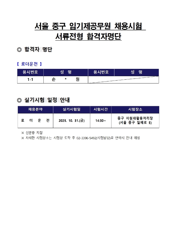 | 서울특별시 중구 임기제공무원 채용시험 서류전형합격자 공고(로더운전) | |||