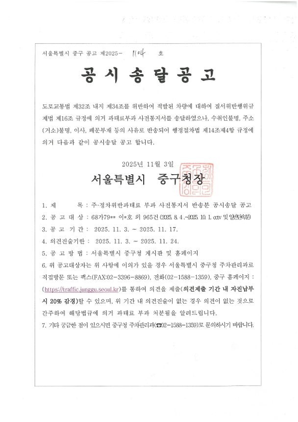| 이전글 | 주정차위반과태료 수시(2025년10월 부과) 반송분 공시송달 |