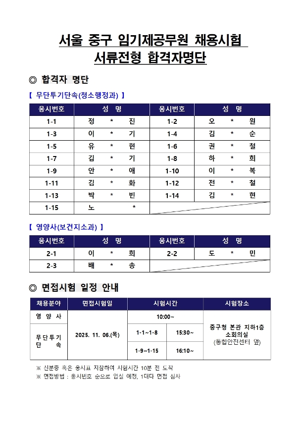 | 서울특별시 중구 임기제공무원 채용시험 서류전형합격자 공고(영양사, 무단투기단속) | |||