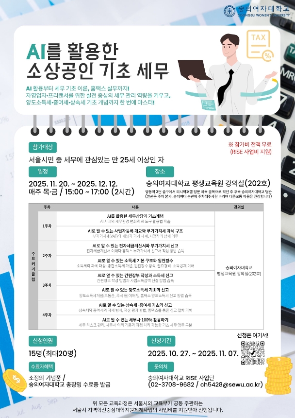 | [숭의여대 RISE사업단] 소상공인 기초세무과정 교육생 모집 | |||