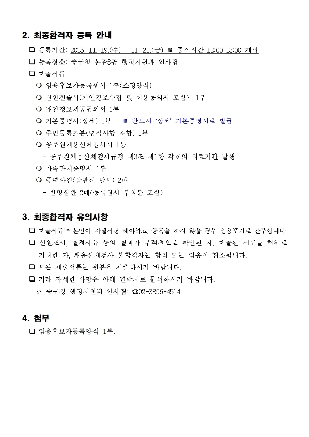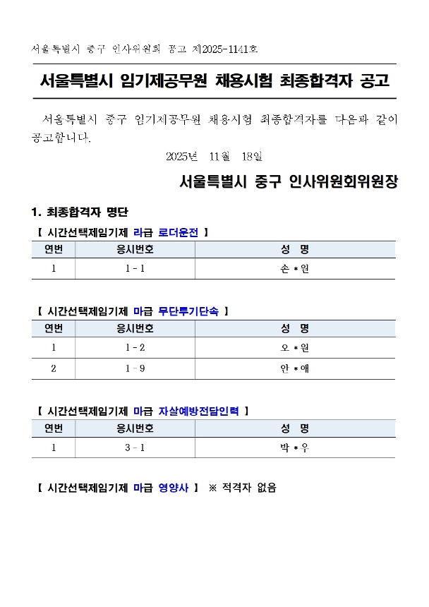 | 서울특별시 중구 임기제공무원 채용시험 최종합격자 공고(로더운전, 무단투기, 자살예방, 영양사) | |||