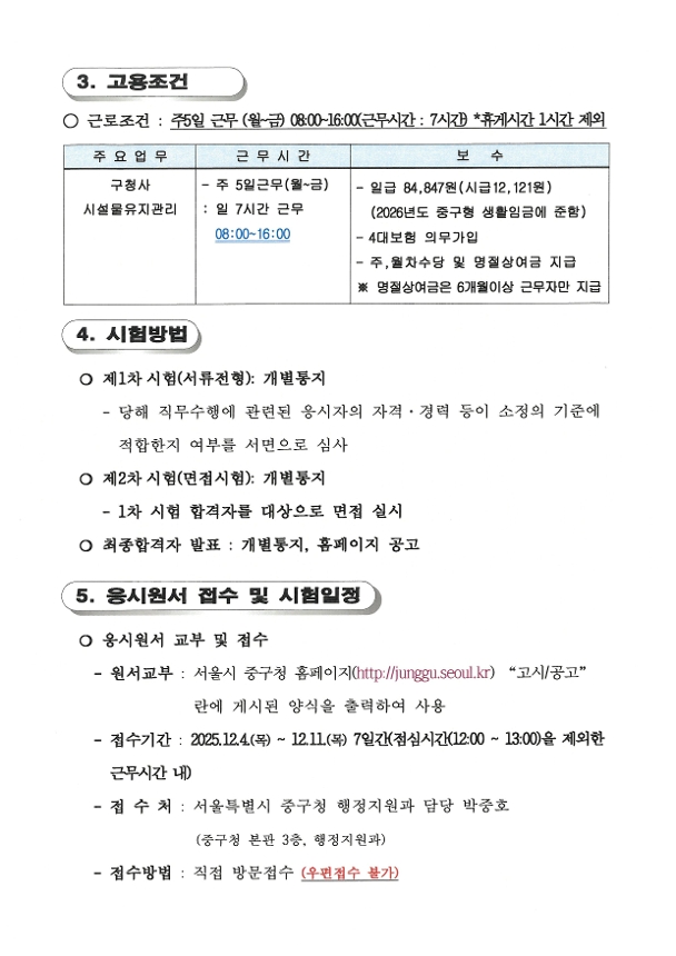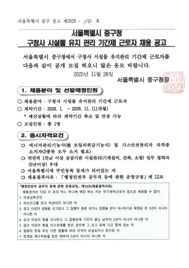 | 2026년 서울특별시 중구청 구청사 시설물 유지관리 기간제근로자 채용 공고 | |||