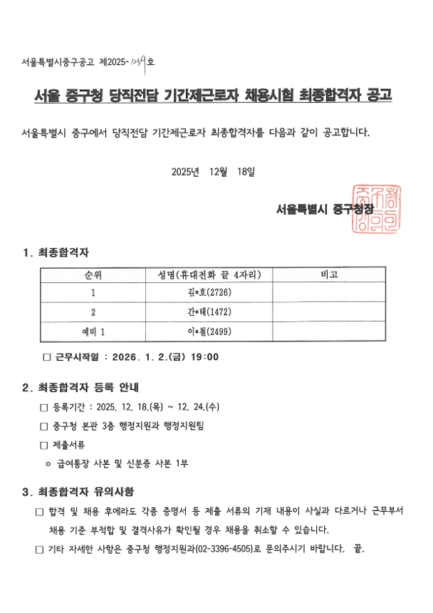 | 2026년 당직전담직원 기간제근로자 채용 최종합격자 공고 | |||