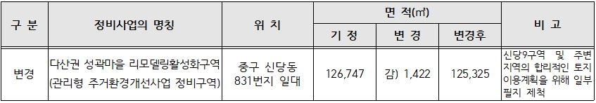 서울특별시 중구 고시 제2025-97호(2025. 12. 4.)에 따라 변경(경미한 사항)결정된 중구 신당동 831번지 일대 다산권 성곽마을 관리형 주거환경개선사업과 관련하여 「서울특별시 리모델링 활성화구역 지정지침」 제2조 등에 따라 리모델링 활성화구역 변경 지정을 아래와 같이 공고합니다. 2025년 12월 19일