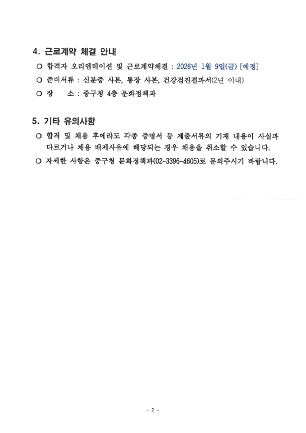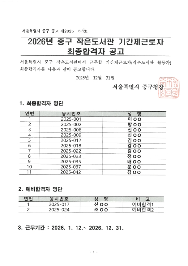 | 2026년 중구 작은도서관 기간제근로자 최종합격자 공고 | |||