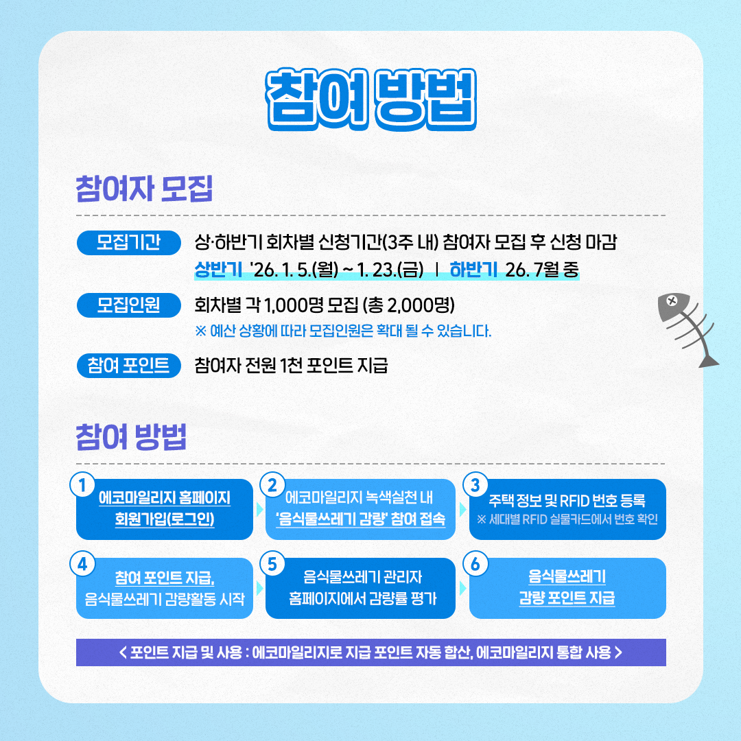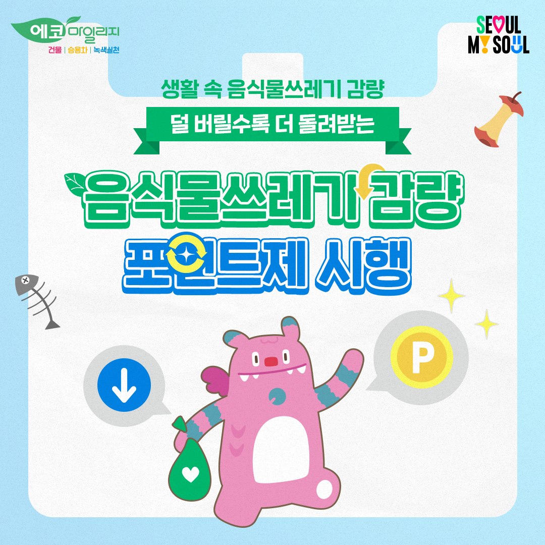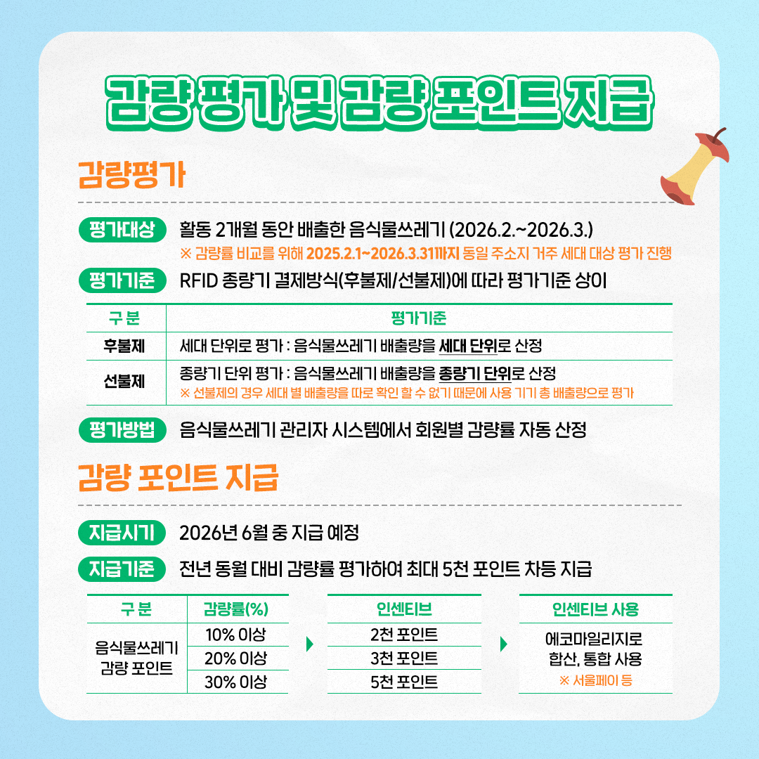 <2026년 음식물감량 포인트제 시행> º사업명 : 음식물쓰레기 감량포인트제 º사업기간 : 2026년 1월 ~12월 ※상하반기 각 1회씩 추진 º참여대상 : 에코마일리지 개인회원 중 RFID 종량기로 음식폐기물을 배출하는 세대 º주관부서: 서울특별시 생활환경과 02-2133-3745 º기타 자세한 사항은 첨부된 안내문 참조 ![]() ![]() ![]() ![]()