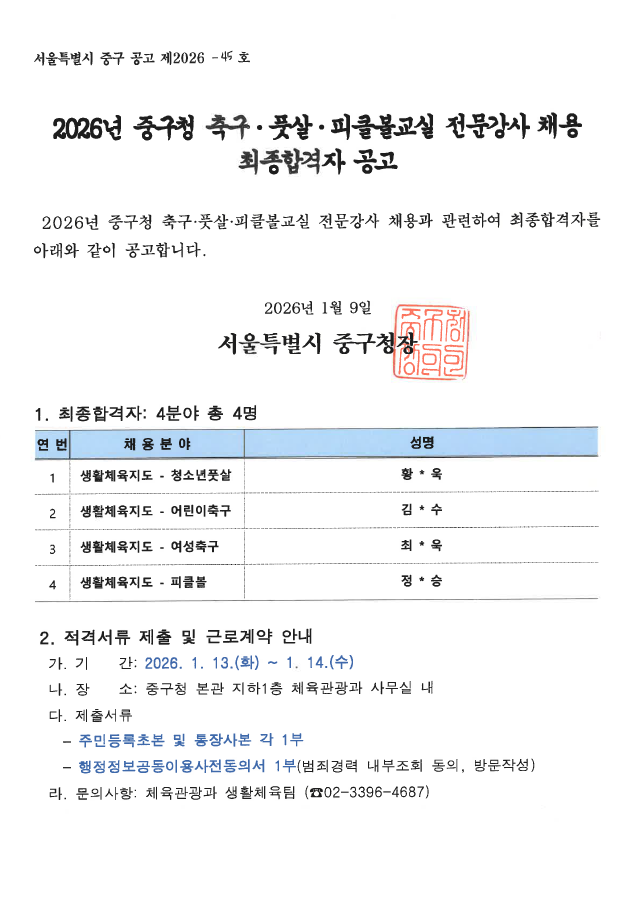 | 2026년 중구청 생활체육교실 전문강사 채용 최종합격자 공고 | |||