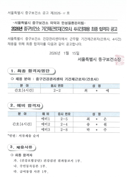 | 2026년 중구건강관리센터 기간제 근로자(간호사, 4시간) 채용 최종 합격자 공고 | |||