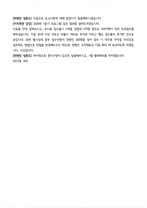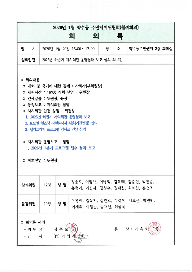 | 회의제목 | 2026년 1월 약수동 주민자치위원회 월례회의 회의록 공개 | ||
