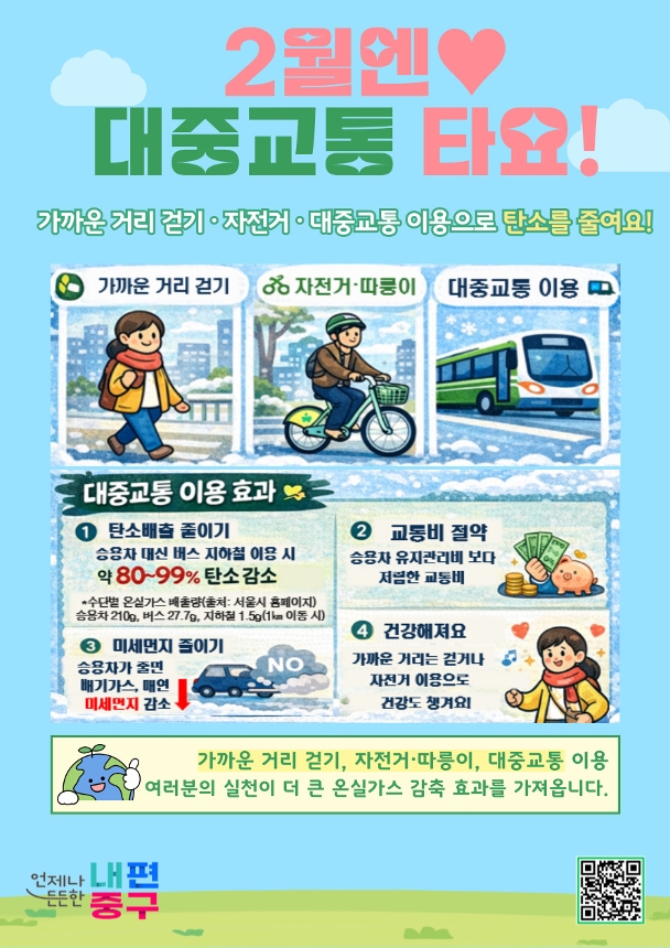 ※ 매달 기후실천 행동을 실천하고 인증사진을 올려주세요! - 2월 실천 행동 : 대중교통 이용하기 - [인증방법] 한달에 한번만 인증, 구글 폼 사용 1) 링크 클릭 후 인증 https://docs.google.com/forms/d/e/1FAIpQLSeL06fTzxzpLOr01XmEDlH0UhkxXiWbwKo3uxyNcKzUFh5S-w/viewform?usp=header 2) QR코드 스캔 후 인증 : 붙임 홍보지의 QR코드 스캔 - [참여혜택] : 10명을 추첨하여 지속적으로 탄소중립을 실천할 수 있는 홍보물품 지급(1만원 상당) * 인증 시 핸드폰번호 입력 오류로 인해 연락이 안될 시 제외 - [문의] 중구청 환경과 ☎ 02-3396-5636 <교육자료> “승용차 대신 대중교통 이용하기” 일상 속 작은 이동 습관의 변화만으로도 탄소 배출을 크게 줄일 수 있다는 사실, 알고 계셨나요? 서울시 자료에 따르면 승용차는 1km 이동 시 약 210g의 이산화탄소(CO₂)를 배출하는 반면, 버스는 약 27.7g, 지하철은 약 1.5g에 불과합니다. 이는 승용차 대신 대중교통을 이용할 경우 탄소 배출을 최대 90% 이상 줄일 수 있음을 의미합니다. 가까운 거리는 걷고, 자전거와 따릉이를 이용하며, 이동이 필요한 경우에는 버스나 지하철을 선택해 주세요. 이러한 작은 실천이 모이면 미세먼지와 온실가스를 줄이고, 건강한 도시 환경을 만드는 큰 힘이 됩니다. 이번 2월, 승용차 대신 대중교통 이용하기에 동참해 주세요. 구민 여러분의 한 걸음, 한 번의 선택이 기후위기 대응의 출발점이 됩니다. (출처) https://global.seoul.go.kr/web/news/senw/bordContDetail.do?brd_no=5&lang=KO&mode=W&post_no=05BF72F1A6C60132E063C0A8A023B65C&utm_source=chatgpt.com
