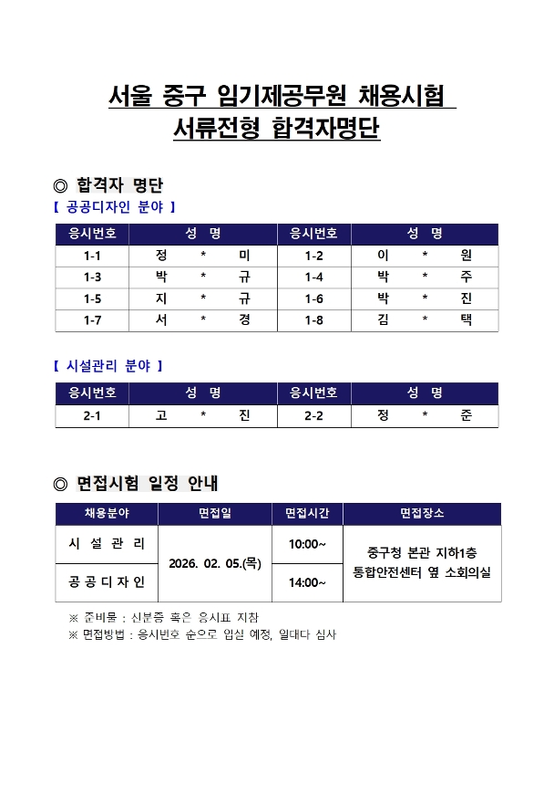 | 서울특별시 중구 임기제공무원 채용시험 서류전형합격자 공고(시설관리, 공공디자인) | |||