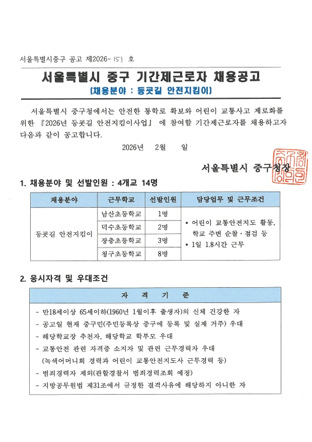 | 등굣길 안전지킴이 기간제근로자 채용공고 | |||