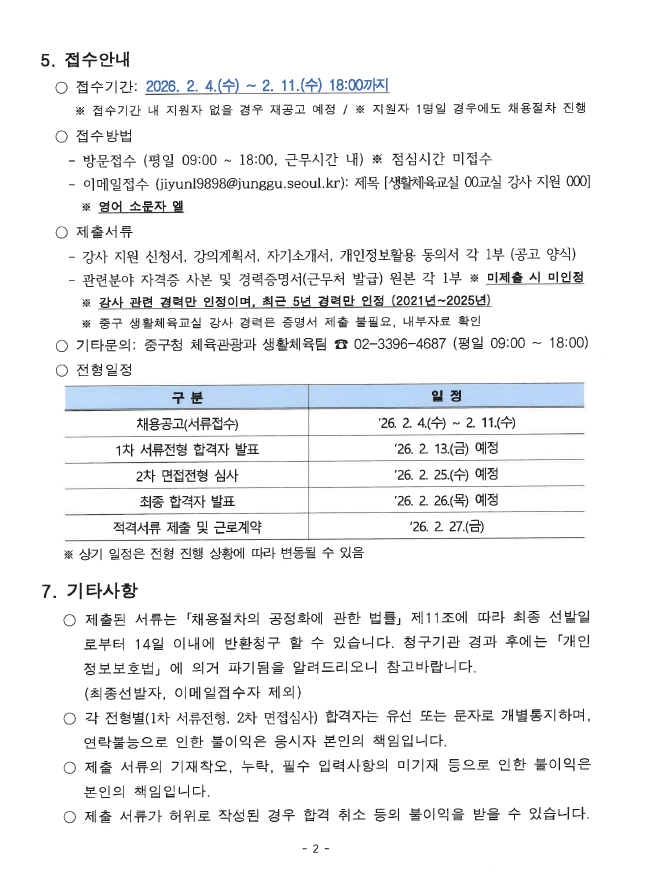 | 2026년 중구청 생활체육교실 전문강사 채용 공고 | |||
