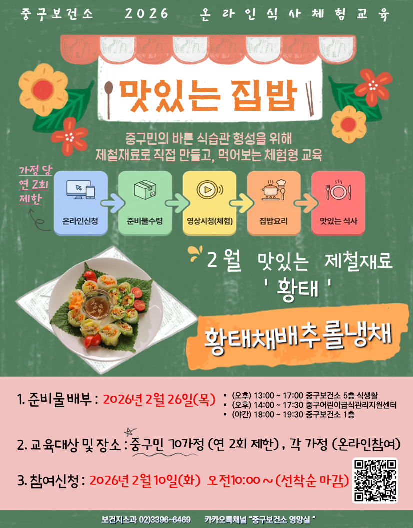 구민의 바른 식습관 형성을 위해 집밥과 같은 건강한 음식을 직접 만들고, 먹어보는 중구 건강플레이팅 프로젝트를 운영하고 있습니다. 본 교육은 매 주제별 참여 대상자분들께 교육 영상과 준비물(일부)을 제공하여 각 가정에서 가족들과 함께 체험하는 온라인교육입니다. 2026년에는 제철식품요리를 주제로 진행합니다. 중구민 중 참여를 원하시는 분들은 아래 세부내용을 확인 하신 후 신청해 주세요. ![]() ★ 2026년 2월 신청 접수는 2월 10일(화) 오전 10시부터 선착순으로 접수됩니다. ★ [2월 맛있는 식품 '황태' 요리 만들기] 신청하기 ☞ https://moaform.com/q/cewIrQ |