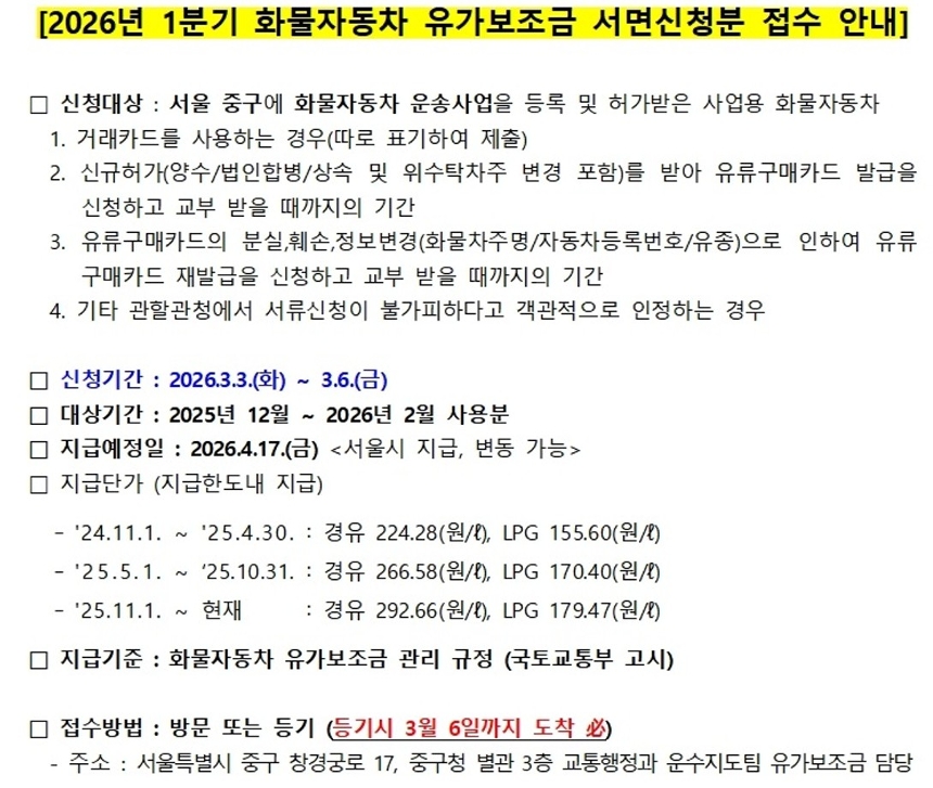 | 2026년 1분기 화물자동차 유가보조금 서면신청분 접수 안내 | |||