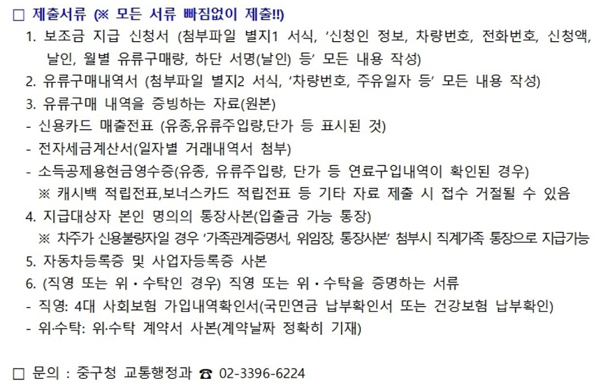 ![]() ![]() [2026년 1분기 화물자동차 유가보조금 서면신청분 접수 안내] □ 신청기간 : 2026.3.3.(화) ~ 3.6.(금) □ 대상기간 : 2025년 12월 ~ 2026년 2월 사용분 □ 지급예정일 : 2026.4.17.(금) <서울시 지급, 변동 가능> □ 접수방법 : 방문 또는 등기 (등기시 3월6일까지 도착 必) - 주소 : 서울특별시 중구 창경궁로 17, 중구청 별관 3층 교통행정과 운수지도팀 유가보조금 담당 □ 문의 : 중구청 교통행정과 ☎ 02-3396-6224 □ 상세내용 : 붙임 참조 |