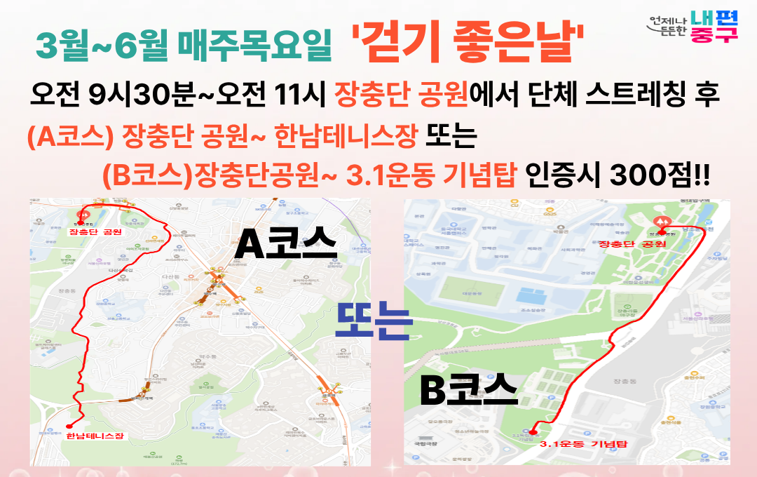 <목요 걷기좋은날 운영 변경 안내> 3월5일 ~ 6월 매주 목요일 오전9시30분 장충단공원에서 진행되는 걷기좋은날이 인증지점(출발점,반환점) 모두 인증시 마일리지 300점 지급으로 바뀝니다. A코스 : 출발점)장충단공원 ~ 반환점)한남테니스장 B코스 : 출발점)장충단공원 ~ 반환점)3.1운동 기념탑 ![]() 문의 3396-6957 |