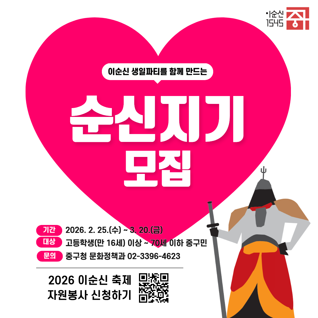 2026 이순신 축제를 함께 만들어갈 주민자원활동가 '순신지기'를 아래와 같이 모집하오니, 많은 참여바랍니다. □ 모집개요 ㅇ 모집기간 : 2. 25.(수) ~ 3. 20.(금) ※ 3월말 선발(개별 문자 안내) ㅇ 모집대상 : 고등학생(만16세) 이상 ~ 70세 이하 중구민 □ 활동개요 ㅇ 활동기간 : 3월말 선발 ~ 4.25.(토) 축제당일 ㅇ 활동장소 : (축제 전) 중구 일대, (축제당일) 명보사거리 행사장 ㅇ 활동내용 - 오리엔테이션 및 관내 편의시설 내 홍보 포스터 부착(3월말 1회), 행사장 일대 플로깅(4월중 1회) - 행사당일 운영지원 ☆ 신청방법(택1) ① 신청링크 ☞ https://naver.me/Gow9F0qL ② 첨부 신청서 제출(→ 문화정책과 방문 또는 이메일 kyungjoo@junggu.seoul.kr 스캔 송부) ![]() ㅇ 문의 : 중구청 문화정책과 ☎ 02-3396-4623 |