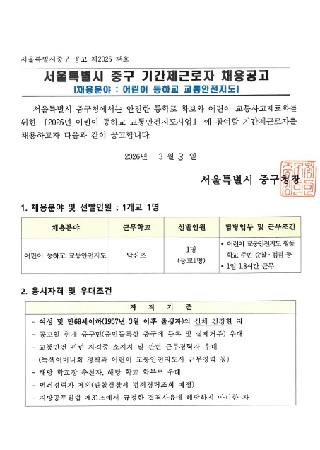 | 기간제근로자(어린이 등하교 교통안전지도사) 채용 재공고 | |||