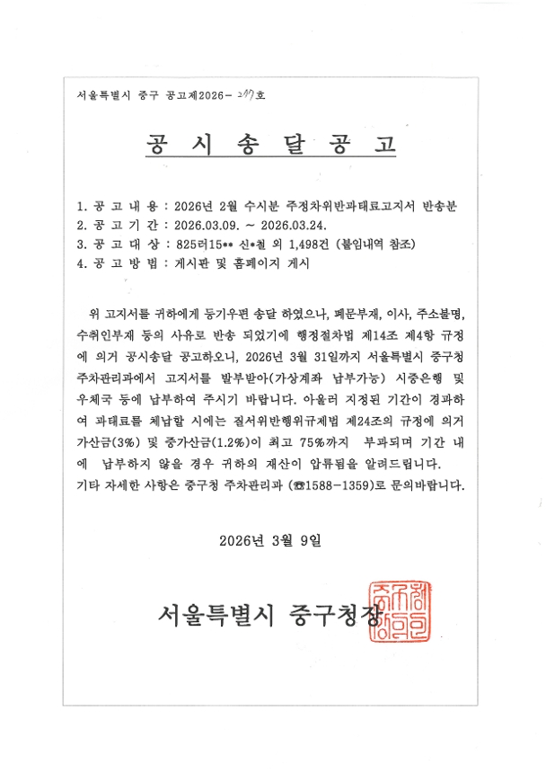 | 주정차위반과태료 수시(2026년 2월부과) 반송분 공시송달 | |||