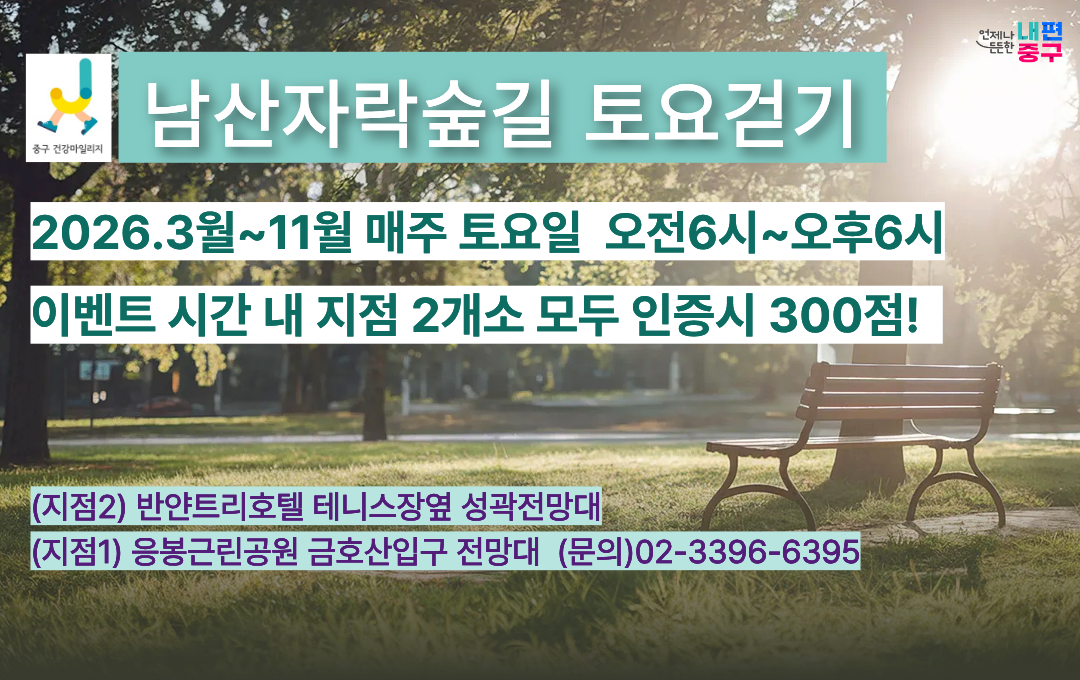 남산자락숲길 '토요 걷기' 참여 안내 기간 : '26년 3월~11월 매주 토요일 오전6시 ~ 오후6시 장소 : 남산자락숲길 인증 구간내 (인증 지점 : 응봉근린공원 금호산입구 전망대 ~ 반얀트리호텔 테니스장 앞 성곽전망대) 참여 방법 : 남산자락숲길 인증 지점(2개소) 구간을 개인별 자율 걷기, 인증 지점에서 '중구 건강마일리지앱'에 접속 및 이벤트 참여 인증하면 건강마일리지 300점 지급 문의 : 중구보건소 보건지소과 02-3396-6395