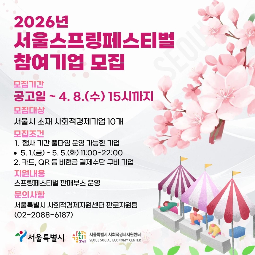 ![]() 1. 행사개요 ? 행 사 명 : 2026년 서울스프링페스티벌 ? 행사기간 : 2026. 5. 1.(금) ~ 2026. 5. 5.(화) 11:00 ~ 22:00, 5일간 ? 행사장소 : 마포대교 남단(여의나루 방면) ? 사회적경제기업 및 소셜벤처의 제품 홍보와 판로 확대를 도모하고, 시민과의 직접적인 만남 기회를 제공 2. 모집개요 ? 공 고 명 : 2026년 서울스프링페스티벌 참여기업 모집 ? 모집규모 : 판매부스 10개 기업 ? 모집기간 : 공고일 ~ 2026. 4. 8.(수) 15:00시까지 ? 모집대상 : 서울시 관내 사회적경제기업((예비)사회적기업, (사회적)협동조합, 마을기업, 소셜벤처) ? 모집조건: * 페스티벌 기간 풀타임 (5일, 5.1.(금) ~ 5.5.(화) 11:00~22:00) 운영이 가능한 기업 * 카드, QR 등 비현금 결제수단 구비 기업 * 행사 운영 규정 및 주관기관 안내사항 준수 가능 업체 ? 판매제품 : 사회적경제기업 및 소셜벤처 기업의 다양한 제품 ? 지원내용 : * 판매부스 제공, 전기 지원 * 페스티벌 공동 홍보 및 현장 운영 지원 3. 신청방법 ? 접수기간 : ~ 2026. 4. 8.(수) 15:00시까지 ? 접수방법 : 온라인 접수 / jeha2547@sehub.net 4. 문의 : 서울특별시 사회적경제지원센터 판로지원팀 02-2088-6187 |
