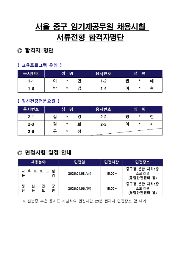 | 서울특별시 중구 임기제공무원 채용시험 서류전형 합격자 공고(교육프로그램 운영, 정신건강전문요원) | |||