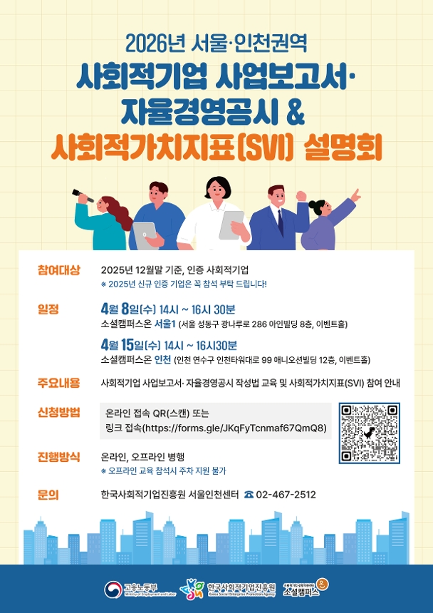 ![]() 한국사회적기업진흥원 서울인천센터에서 사회적기업을 대상으로 진행하는 < 2026년 서울·인천권역 사회적기업 사업보고서 및 자율경영공시 & 사회적가치지표(SVI) 설명회 > ■ 교육명 : 2026년 서울·인천권역 사회적기업 사업보고서 및 자율경영공시 & 사회적가치지표(SVI) 설명회 ■ 교육 일정/장소 (주차 지원 불가) - 4월 8일(수) 14:00 ~ 16:30 (2시간30분) 소셜캠퍼스온 서울1, 이벤트홀(서울 성동구 광나루로 286 아인빌딩 8층) - 4월 15일(수) 14:00 ~ 16:30 (2시간30분) 소셜캠퍼스온 인천, 이벤트홀(인천 연수구 인천타워대로 99, 애니오션빌딩 12층) ■ 교육 대상 : 2007년 1차~2025년 4차 인증 사회적기업(※ 2025년 신규 인증 사회적기업은 꼭 참석 부탁 드립니다.) ■ 교육 진행 방법 : 온라인, 오프라인 병행 ■ 신청방법 : 구글폼 신청서 작성 (https://forms.gle/JKqFyTcnmaf67QmQ8) (또는 웹포스터 QR코드 신청) ■ 문의 : 02)467-2512(소셜캠퍼스온 서울1) |