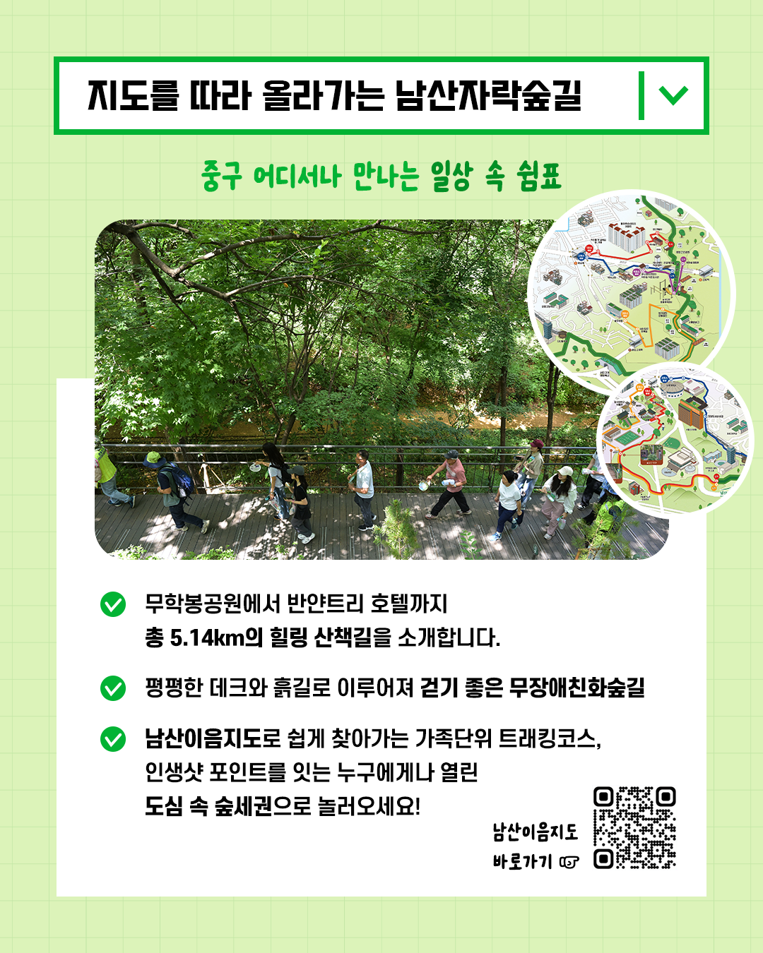 - 도심에서 가까이 즐길 수 있는 어디서나 숲세권, 언제나 남산자락숲길