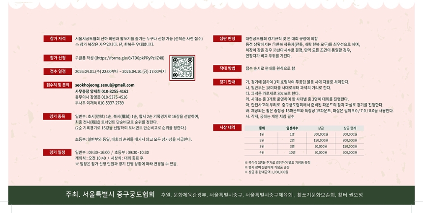 ㅇ 일 시 : 2026. 4. 19.(일) 09:30 ~ 16:30 ㅇ 장 소 : 훈련원공원 종합체육관 (중구 을지로227) ㅇ 주최·주관 : 서울특별시 중구 궁도협회 ㅇ 행사내용 - 종합체육관(지하2층) : 활쏘기 대회 (초등/일반) (09:30 ~ 16:30) - 다 목 적 실(1층) : 팀별 대항전(편사대회) (10:00 ~ 16:00) - 야 외 공 원 : 이순신 캐릭터 활용 인생네컷, OX퀴즈 등 (10:00 ~ 16:00) ※ 궁도를 알릴 모든 방문객을 대상으로 활쏘기 체험존, 포토존, OX퀴즈 등 다양한 부대행사를 열릴 예정입니다. ※ 체험존의 원활한 진행을 위해 사전접수를 아래와 경로로 신청받고 있습니다. (미신청시에도 대기 후 참여 가능) 체험마당 신청 URL -> http://vo.la/PRtidTK ※ 일반부 활쏘기 대회참여 → 대회포스터 내 구글폼 또는 QR신청, 한복우대 ※ 행사문의 → 중구 궁도협회 사무총장 양세희 (포스터 내 연락처 참고) ![]()