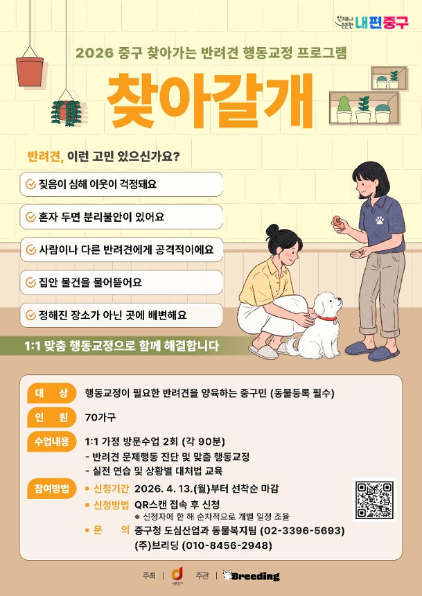 2026 중구 찾아가는 반려견 행동교정 프로그램 '찾아갈개' 운영 □ 지원대상 : 행동교정이 필요한 반려견을 양육하는 중구민 (동물등록 필수) □ 인 원 : 70가구 □ 신청기간 : 2026. 4. 13.(월)부터 선착순 마감 □ 수업내용 : 1:1 가정 방문수업 2회 (각 90분 / 개별 일정 조율) □ 신청방법 : 홍보이미지 QR스캔 접속 후 신청 또는 아래 링크 접속 후 신청 https://www.breeeeeding.com/banner/2026/jungGu/visitClass □ 문의사항 : 도심산업과 동물복지팀 ☎ 02-3396-5693